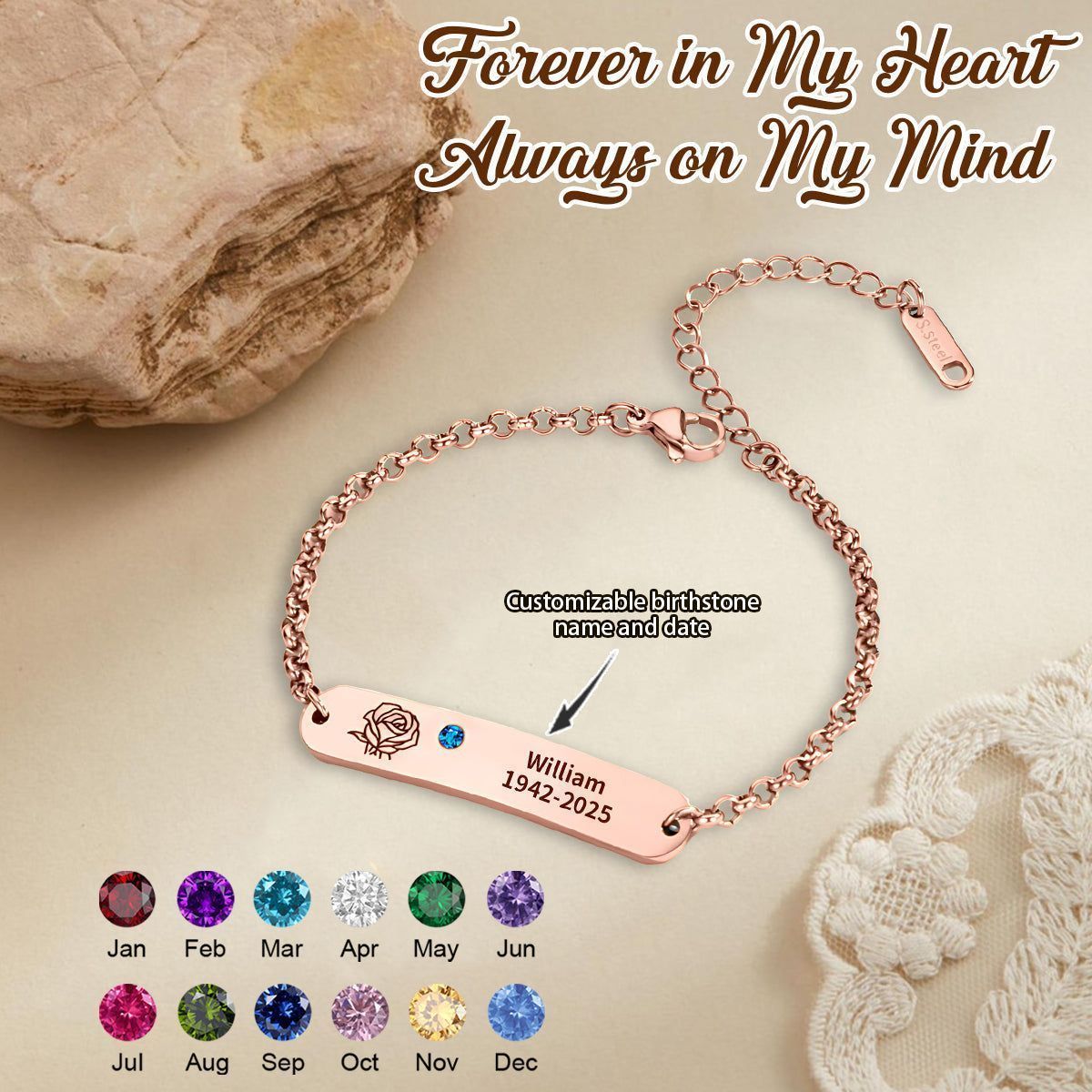 Personalized Name Date and Birthstone Memorial Bracelet